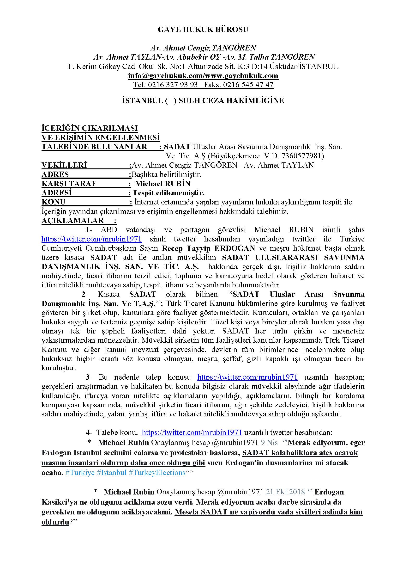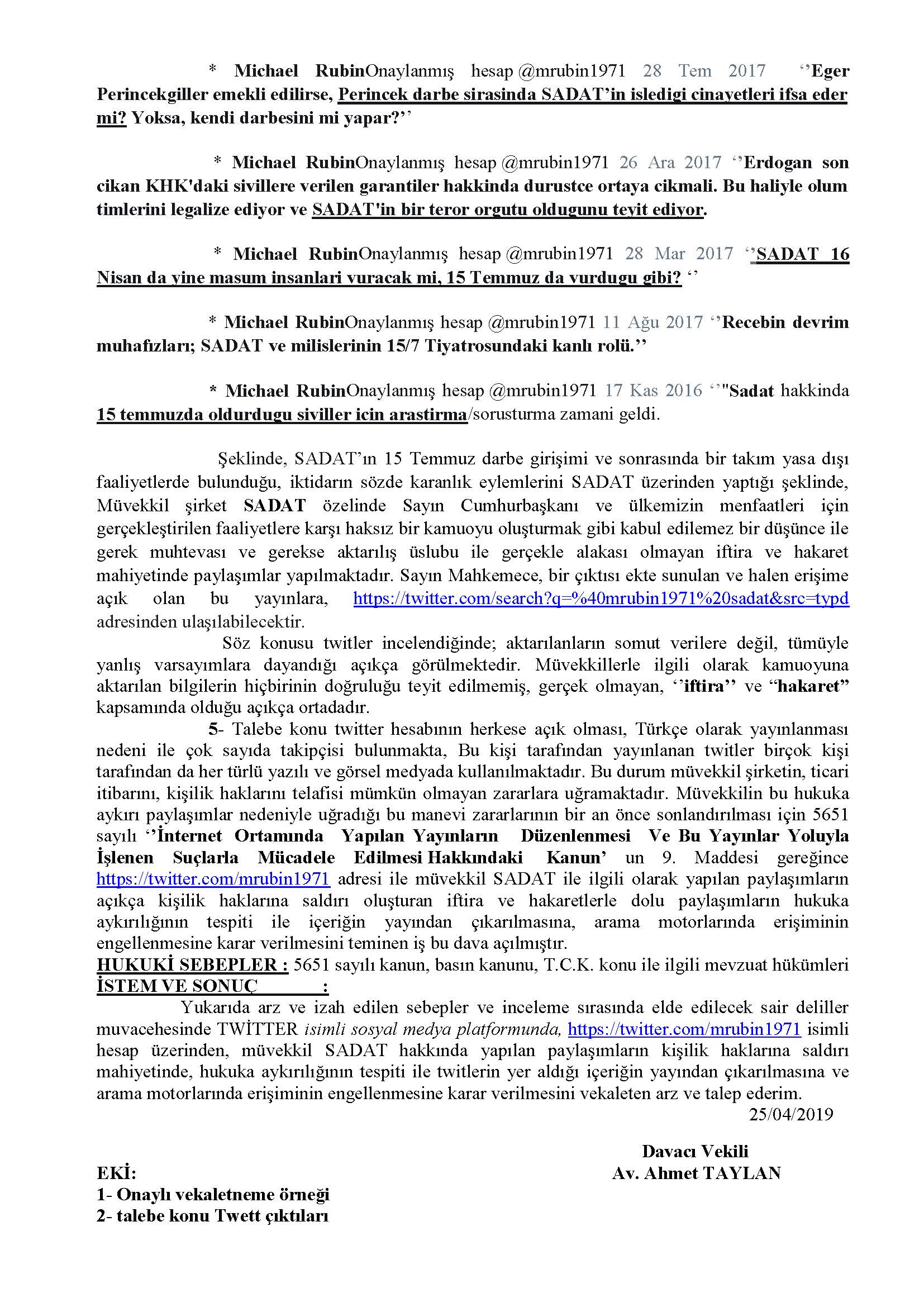 1- شخص اسمه مايكل روبين مواطن من الولايات المتحدة الأمريكية وهو مسؤول في بنتاغون نشر عبر حسابه في التويترhttps://twitter.com/mrubin1971 البيانات والاتهامات البعيدة عن الحقائق والتي تحتوي على الشتائم والافتراءات البعيدة عن الواقع، بقصد الإساءة على الحقوق الشخصية وتشويه السمعة التجارية التي تستهدف المجتمع والرأي العام على رأسهم الرئيس الجمهورية التركية السيد رجب طيب أردوغان والحكمومة الشرعية وصادات المعروفة باسمها المختصر وهي شركة صادات للاستشارات الدفاعية الدولية والانشاءات والصناعة والتجارة المساهمة.