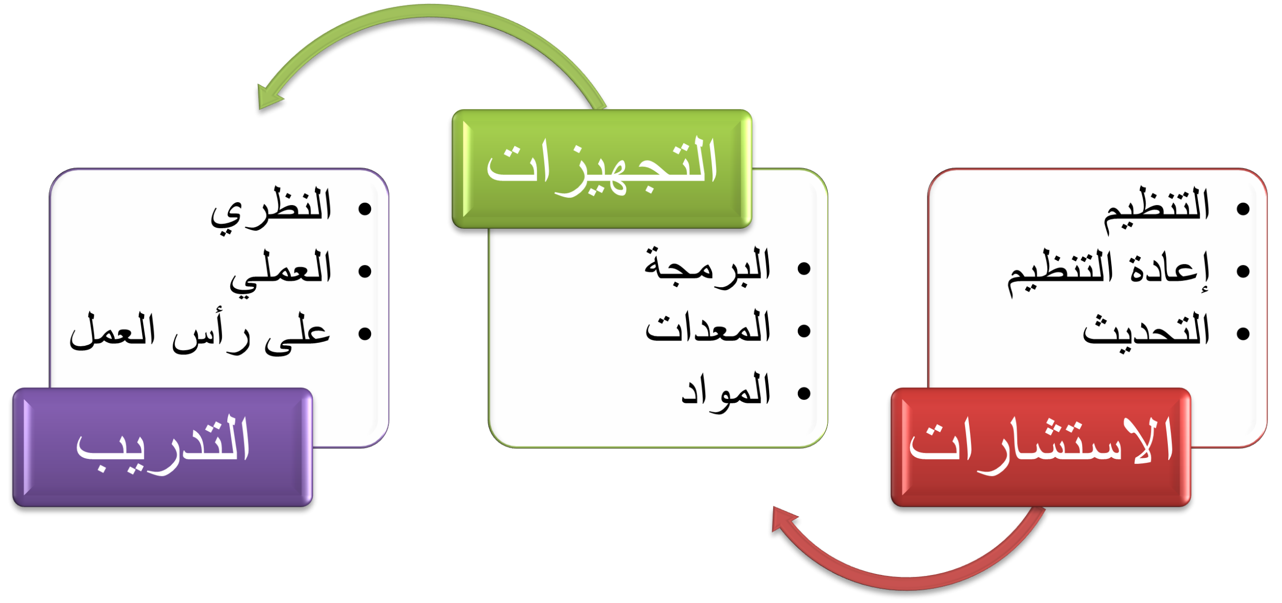 .في مرحلة التنفيذ، يتم إعداد البرامج التدريبية وفقا للاحتياجات التدريبية للكوادر ويتم تقديم التدريبات. إضافة لتلبية الاحتياجات من التجهيزات، والمواد، والمعدات، والبرمجيات.