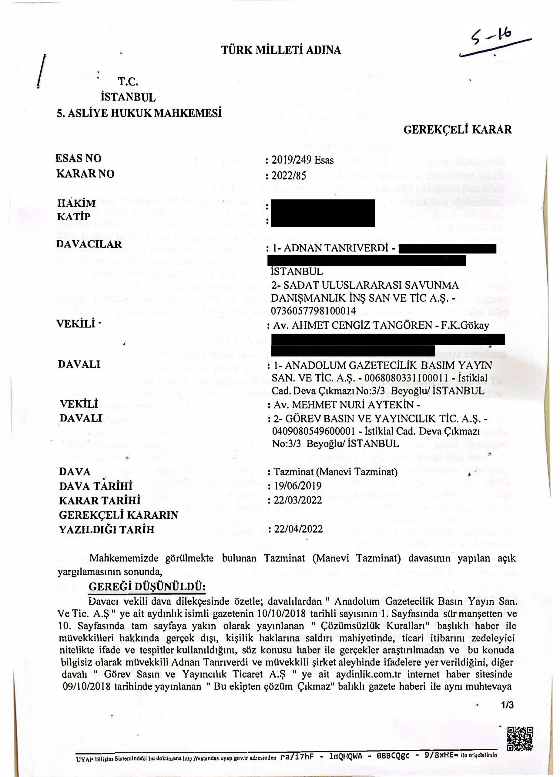 İstanbul 5. Asliye Hukuk Mahkemesi, 10.10.2018 tarihinde aydınlık gazetesinde yayınlanan “Çözümsüzlük Kuralları” haberi ile 09.10.2018 tarihinde aydinlik.com.tr sitesinde yayınlanan “Bu ekipten Çözüm Çıkmaz” haberlerinde Adnan Tanrıverdi ve SADAT Savunma hakkında yaptıkları gerçek dışı, asılsız haberlerden dolayı 10.000 TL manevi tazminat ödemeye karar vermiştir.