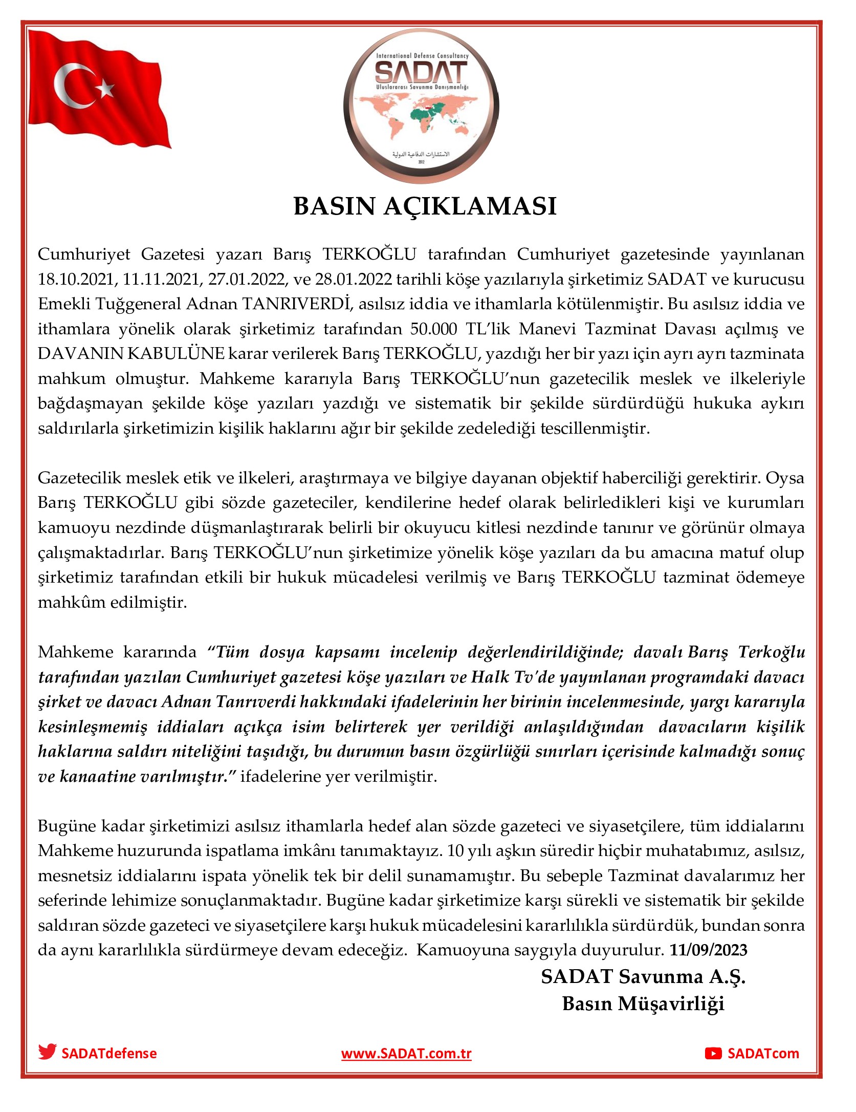 Cumhuriyet Gazetesi yazarı Barış TERKOĞLU tarafından Cumhuriyet gazetesinde yayınlanan 18.10.2021, 11.11.2021, 27.01.2022, ve 28.01.2022 tarihli köşe yazılarıyla şirketimiz SADAT ve kurucusu Emekli Tuğgeneral Adnan TANRIVERDİ, asılsız iddia ve ithamlarla kötülenmiştir. Bu asılsız iddia ve ithamlara yönelik olarak şirketimiz tarafından 50.000 TL’lik Manevi Tazminat Davası açılmış ve DAVANIN KABULÜNE karar verilerek Barış TERKOĞLU, yazdığı her bir yazı için ayrı ayrı tazminata mahkum olmuştur. Mahkeme kararıyla Barış TERKOĞLU’nun gazetecilik meslek ve ilkeleriyle bağdaşmayan şekilde köşe yazıları yazdığı ve sistematik bir şekilde sürdürdüğü hukuka aykırı saldırılarla şirketimizin kişilik haklarını ağır bir şekilde zedelediği tescillenmiştir.