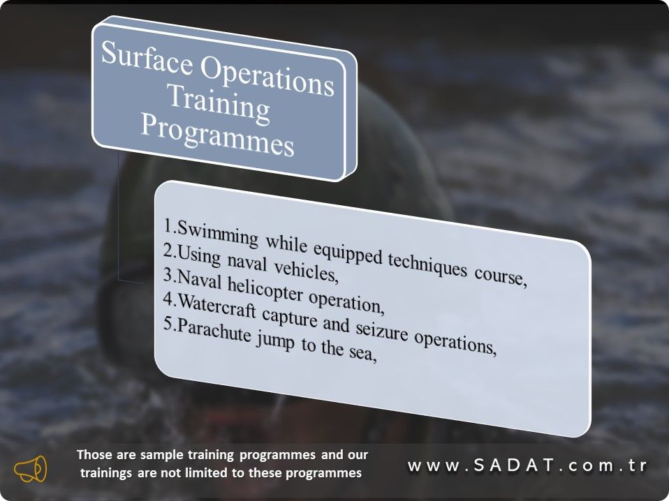 The trainees are given the ability to perform Surface Operations as a result of providing the necessary training to be able to perform operations on surface and on the coast side by using various vehicles (such as speedboats, helicopters, inflatable boats).