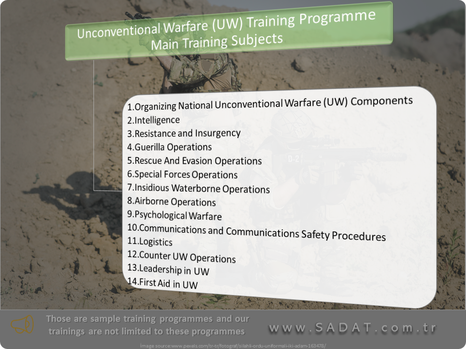 SADAT Defense provides trainings of ambush, raid, road cutting / closing, destruction, sabotage and Rescue / Abduction Operations and “Counter Tactics and Techniques” to above for Unconventional Warfare Organizations and related components for the Need of National Defense Preparations of a country.