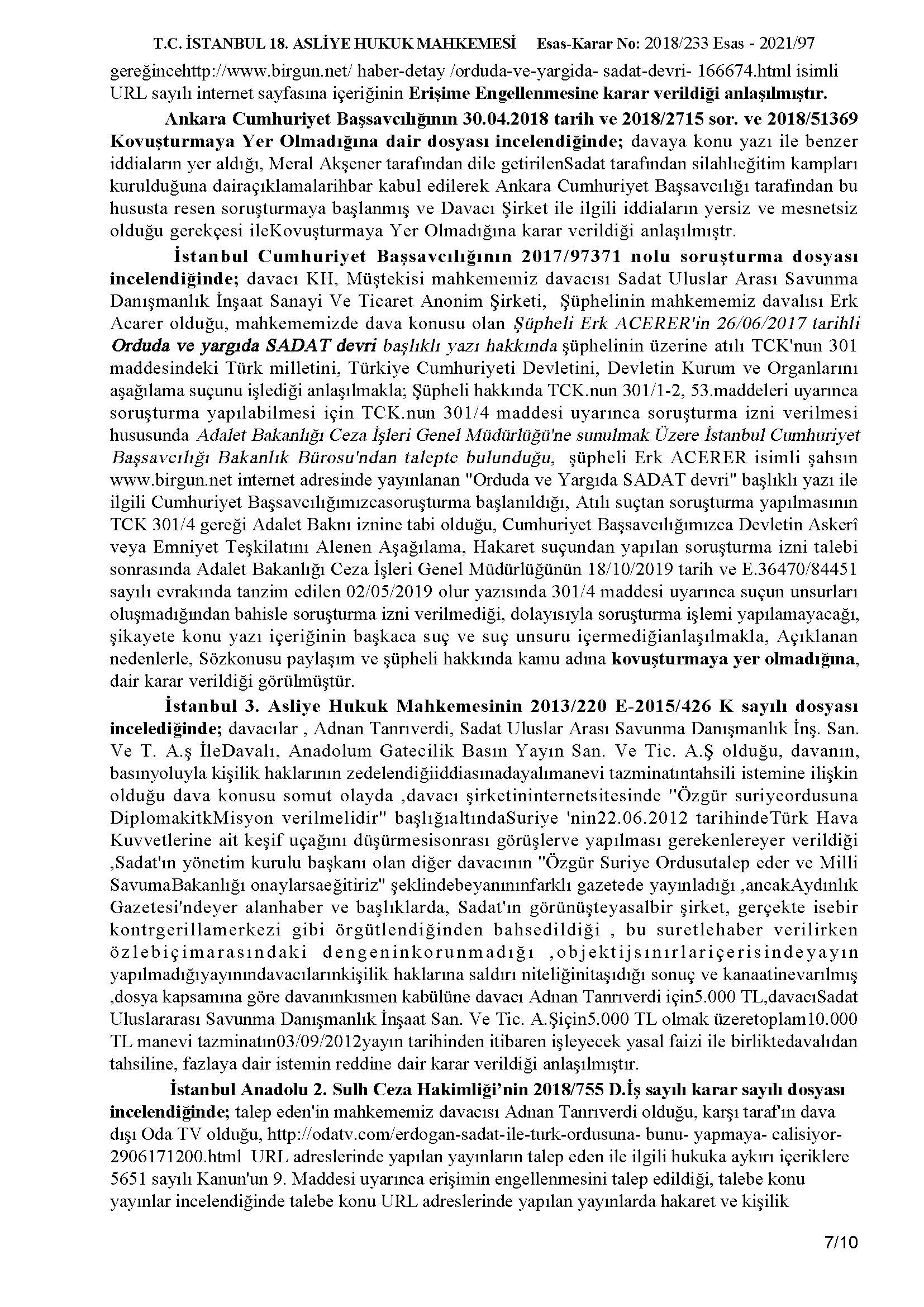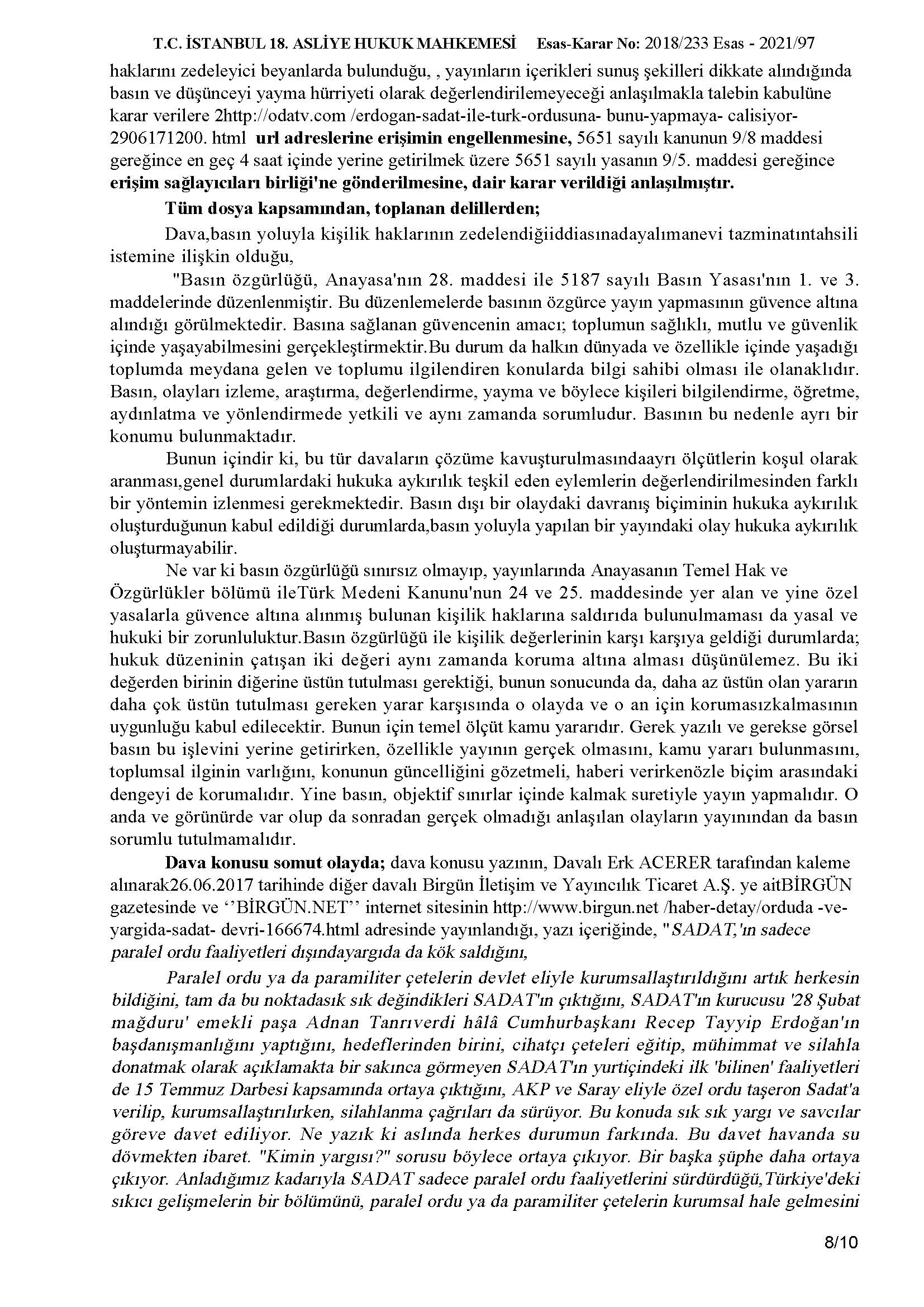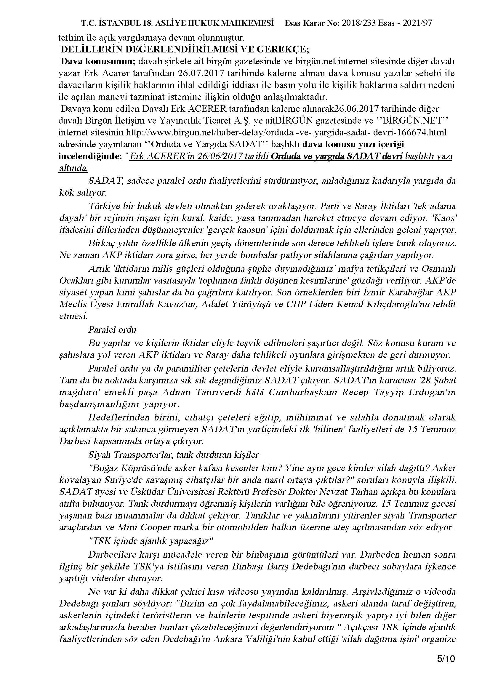 Birgün gazetesinde ve Birgün.net internet sitesinin adresinde Erk Acarer tarafından kaleme alınarak 26/06/2017 tarihinde yayınlanan “Orduda ve Yargıda Sadat” başlıklı yazı ile şirketimiz hakkında yalan, iftira ve asılsız bir takım kulaktan dolma dedikodu mahiyetindeki yersiz itham ve tezyif edici yazısı nedeniyle İstanbul 18. Asliye Hukuk Mahkemesi tarafından tazminat ödemesine karar verilmiştir.