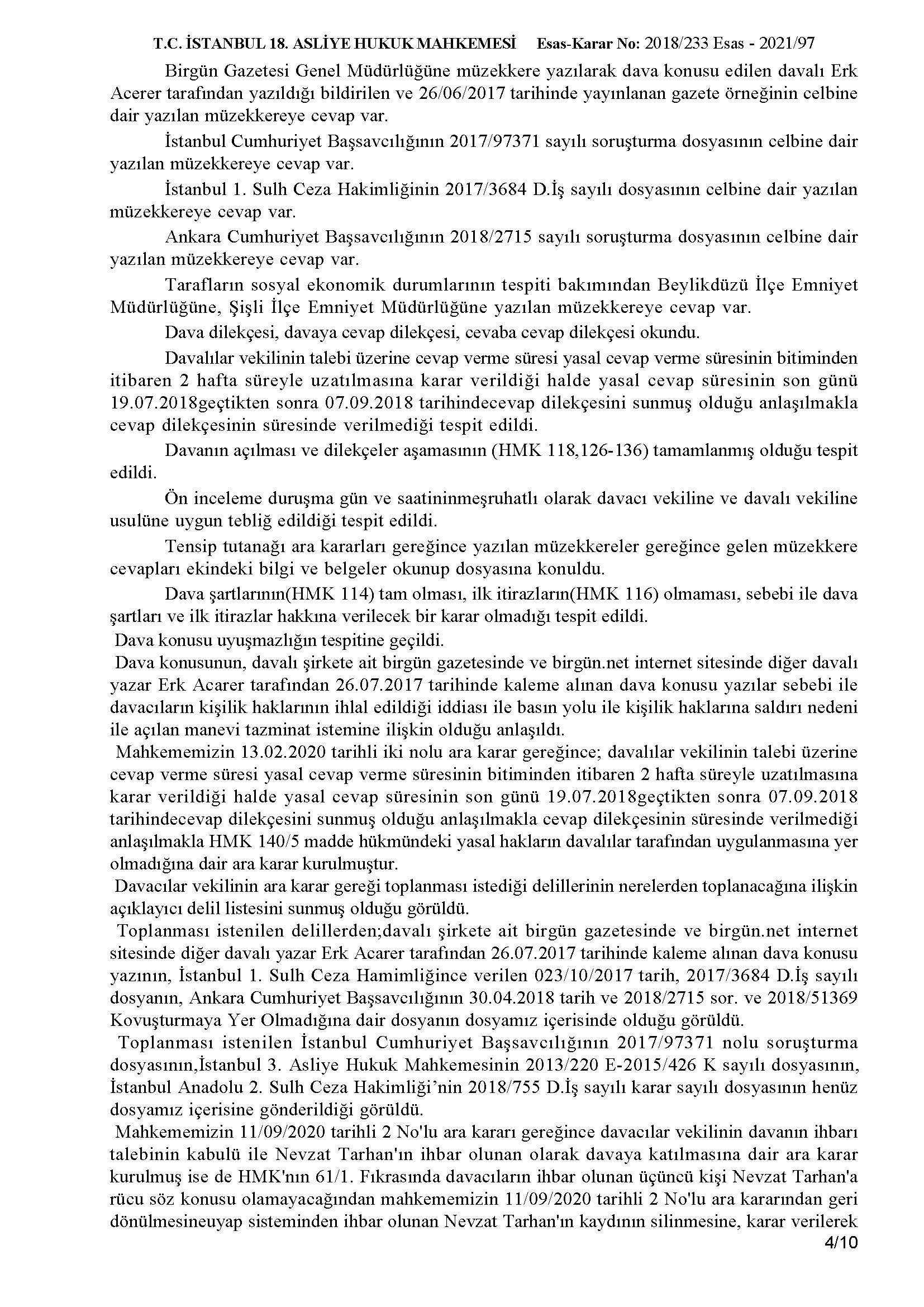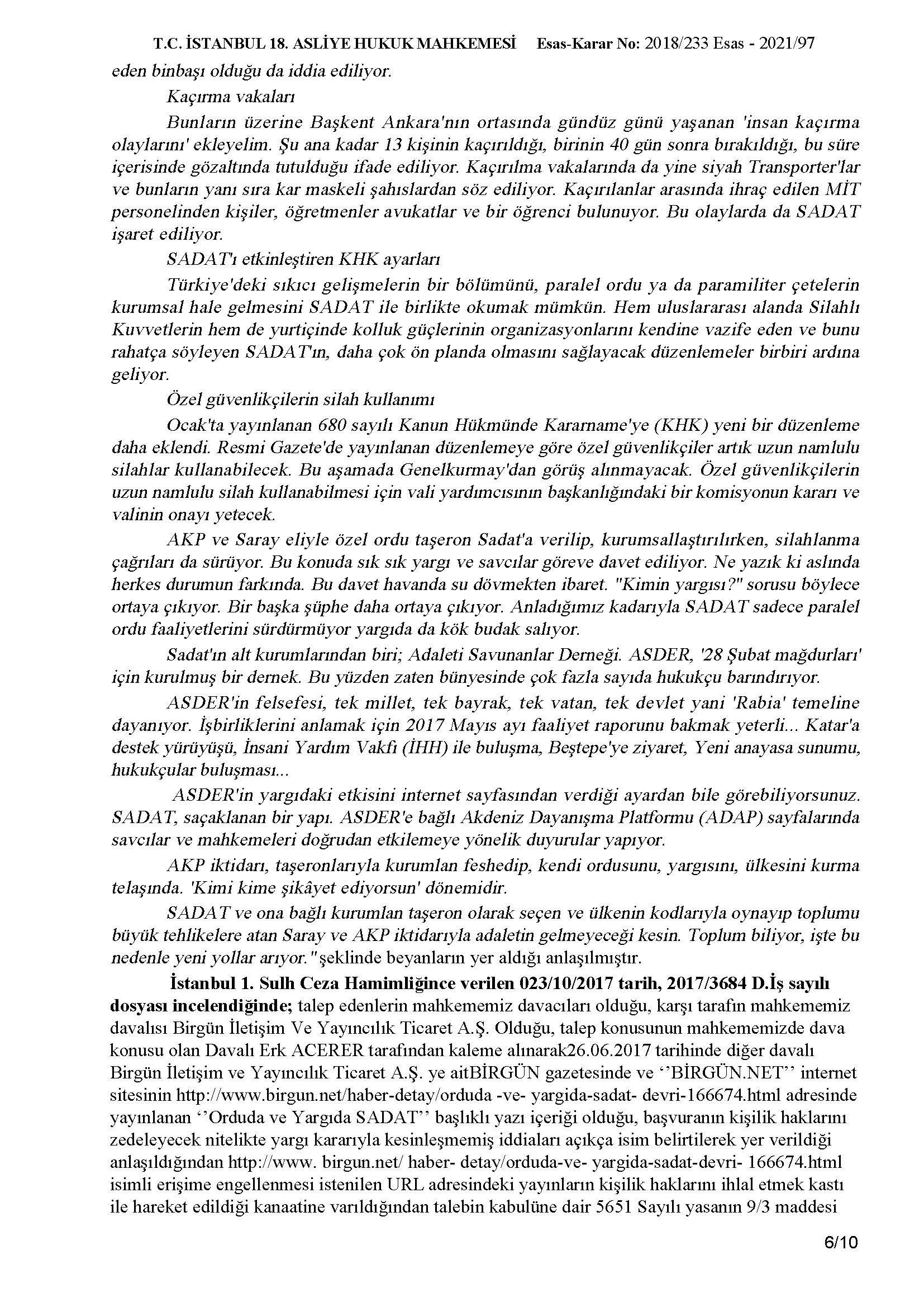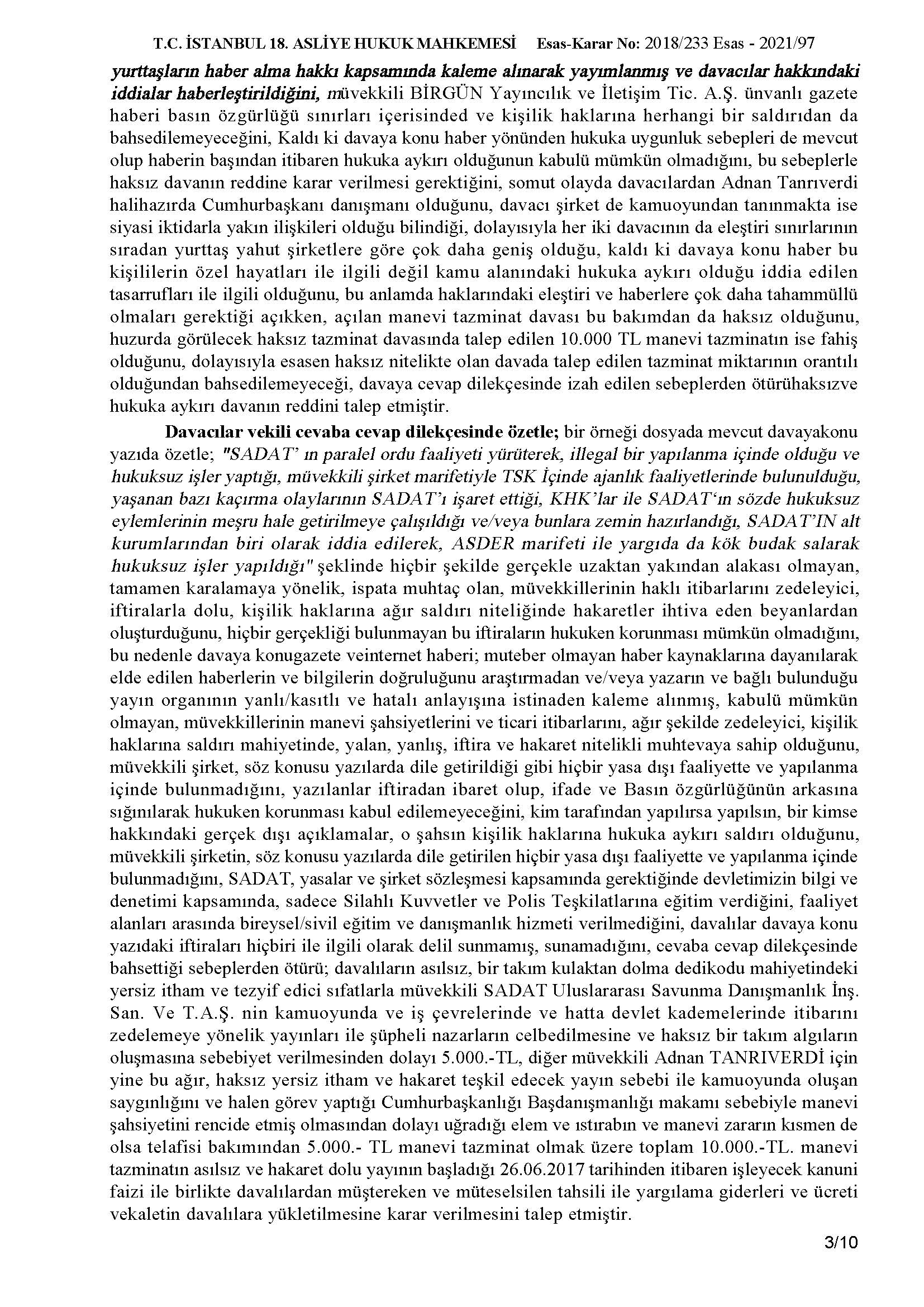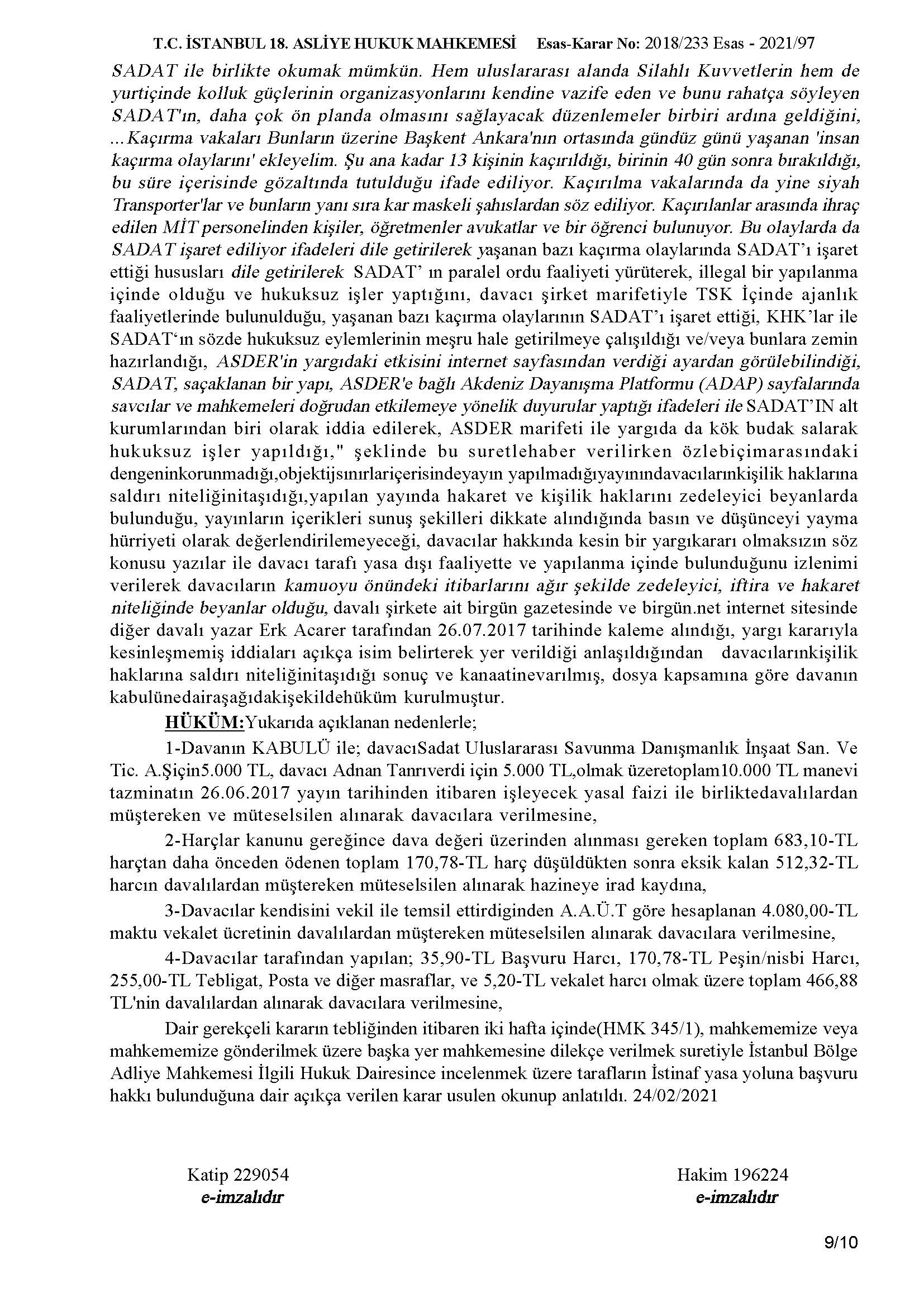 Birgün gazetesinde ve Birgün.net internet sitesinin adresinde Erk Acarer tarafından kaleme alınarak 26/06/2017 tarihinde yayınlanan “Orduda ve Yargıda Sadat” başlıklı yazı ile şirketimiz hakkında yalan, iftira ve asılsız bir takım kulaktan dolma dedikodu mahiyetindeki yersiz itham ve tezyif edici yazısı nedeniyle İstanbul 18. Asliye Hukuk Mahkemesi tarafından tazminat ödemesine karar verilmiştir.