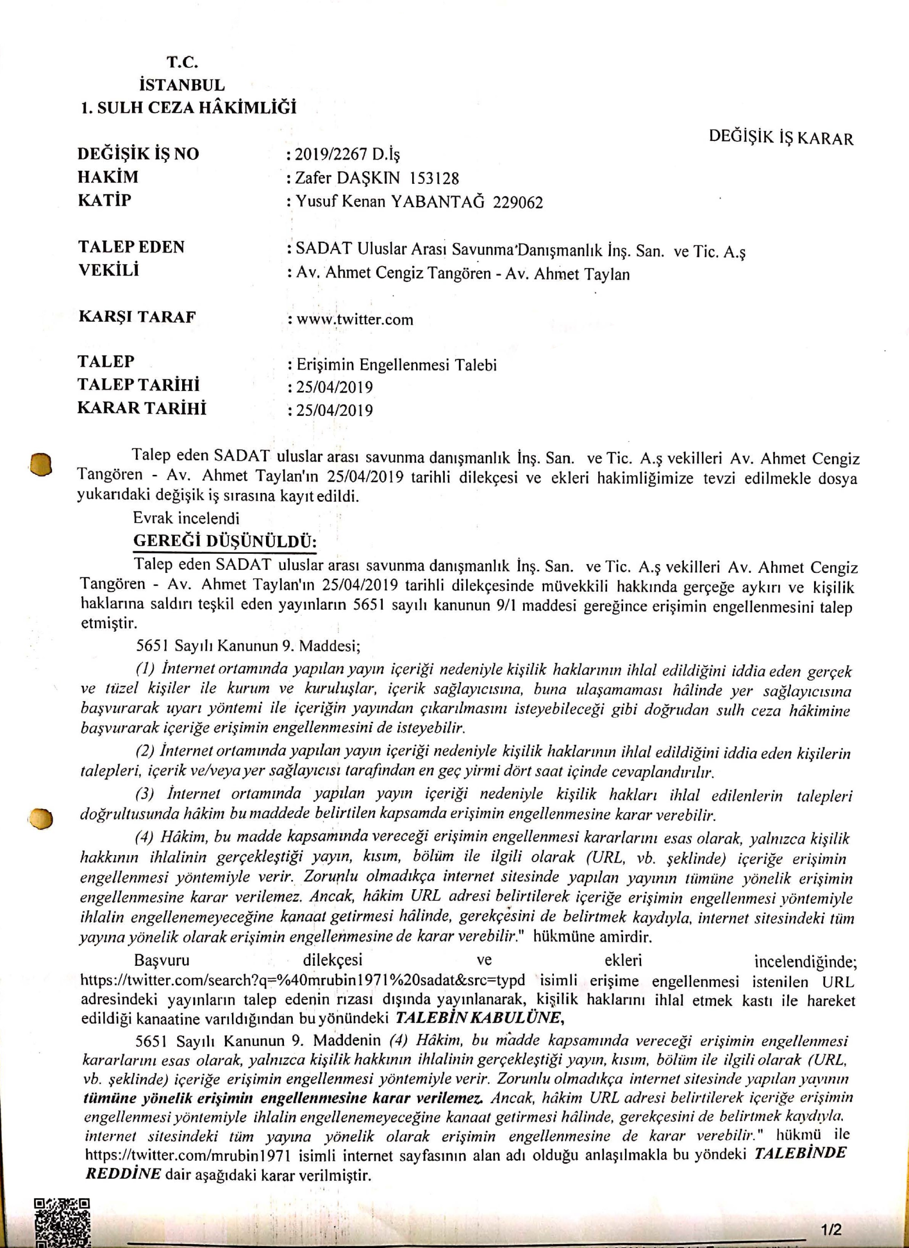 Talep eden SADAT uluslar arası savunma danışmanlık İnş. San. ve Tic. A.ş vekilleri Av. Ahmet Cengiz Tangören – Av. Ahmet Taylan’ın 25/04/2019 tarihli dilekçesinde müvekkili hakkında gerçeğe aykırı ve kişilik haklarına saldırı teşkil eden yayınların 5651 sayılı kanunun 9/1 maddesi gereğince erişimin engellenmesini talep etmiştir.