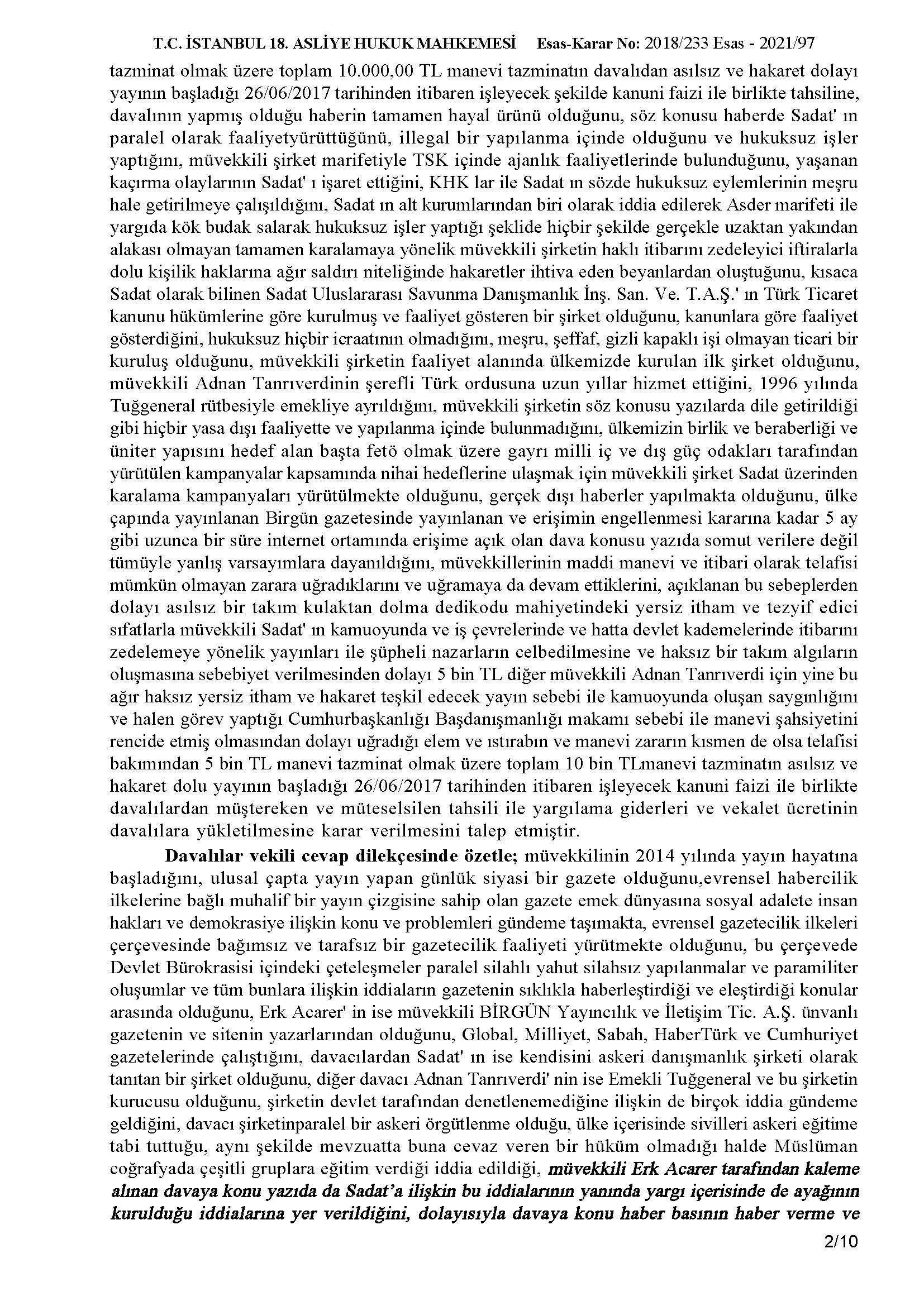 Erk Acarer tarafından 26/06/2017 tarihinde kaleme alınarak birgun.net’te yayınlanan “Orduda ve Yargıda SADAT Devri” başlıklı yazı hakkında açtığımız tazminat davası sonucunda istinaf mahkemesi; dava konusu yazıda en başta bulunması gereken gerçek olma unsuru bulunmadığı ve iddiaların hiçbiri ile ilgili bir soruşturma, bir kovuşturma bulunmadığı gibi, soyut iddiaları destekler somut emare de tespit olunmadığından SADAT Savunma şirketine talep ettiği 10.000TL tazminatın ödenmesine karar vermiştir.