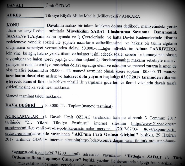 Ümit Özdağ’ın 29 Haziran 2017 tarihinde Oda TV’de, 3 Temmuz 2017’de 21. Yüzyıl Enstitüsünde yayınlanan iftiralarına karşı tazminat davası açılmıştır.
